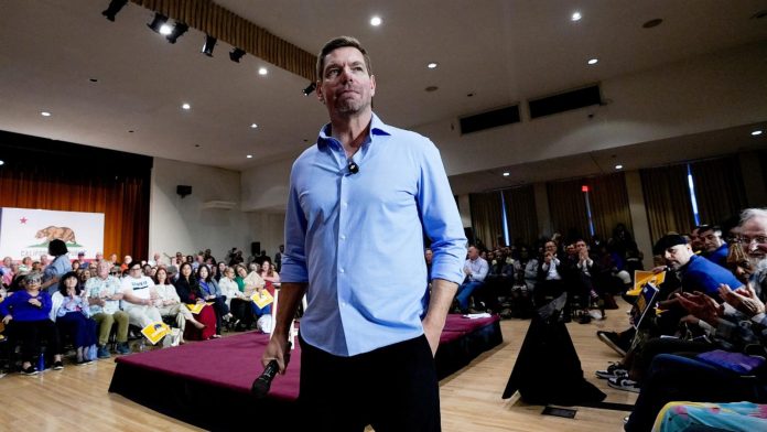 California gubernatorial candidate, Rep. Eric Swalwell appears at a town hall meeting in Sacramento, Calif., April 7, 2026.