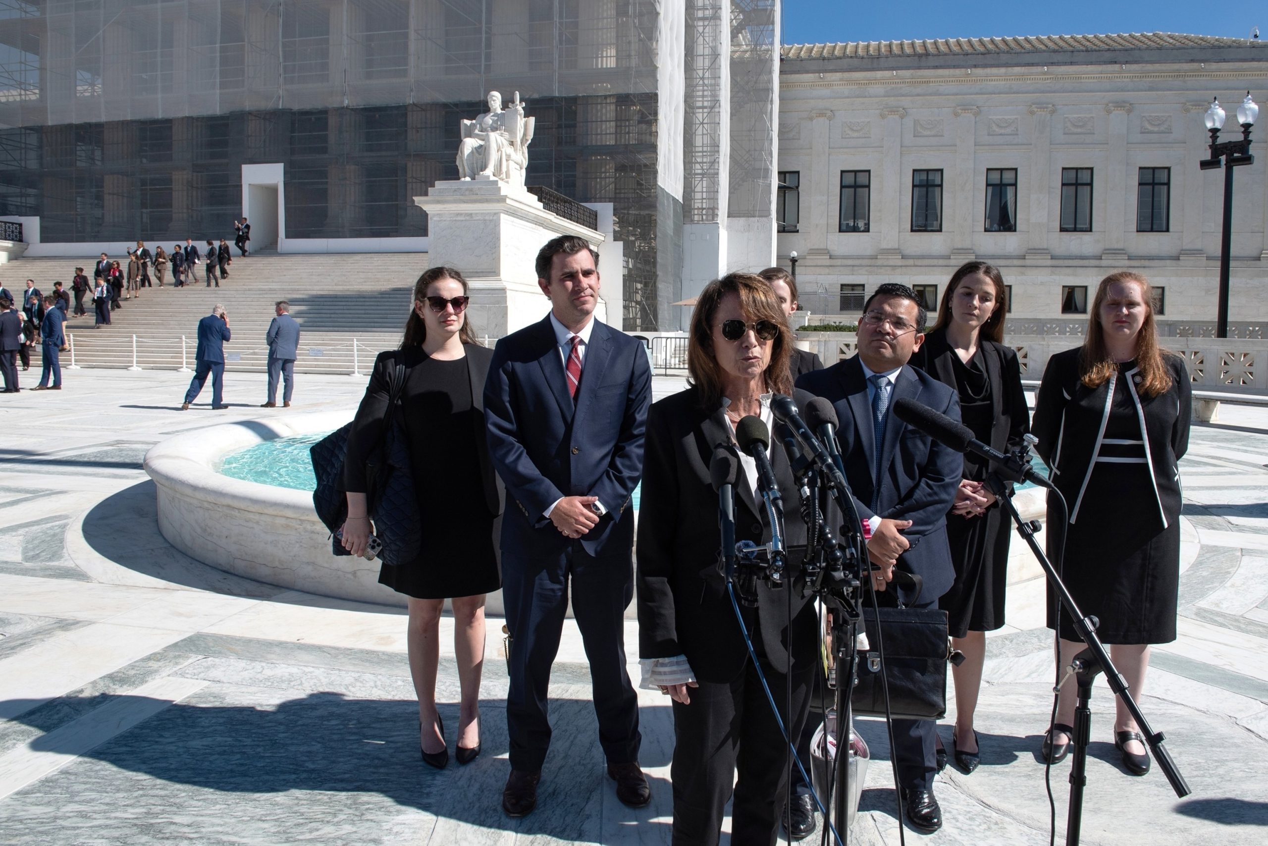 In this Oct. 15, 2025, file photo, Louisiana Attorney General Liz Murrill, center, speaks with the news media upon leaving the Supreme Court after giving arguments in the case drawing new congressional district boundaries, in Washington, D.C.