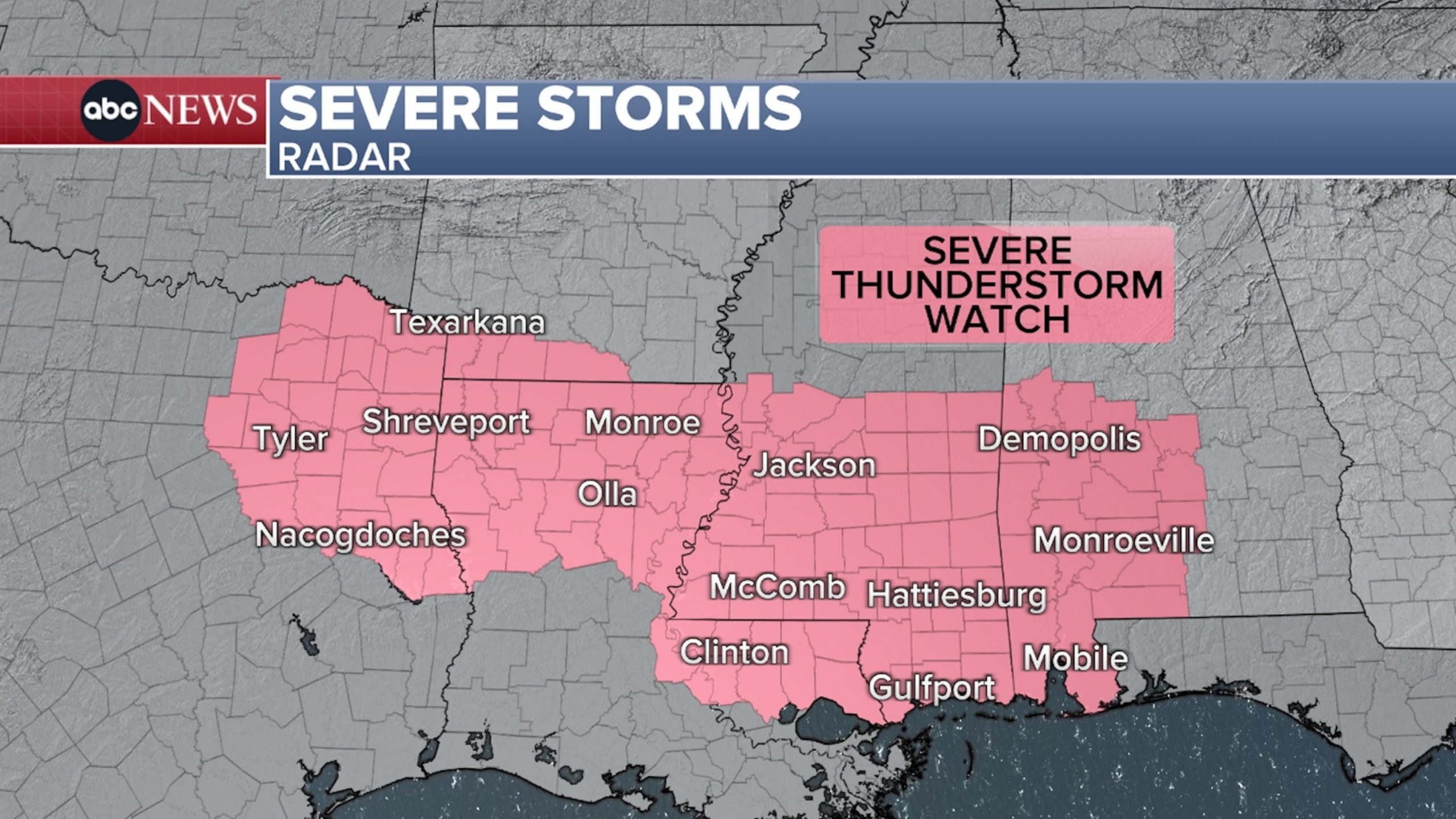 Severe thunderstorm watches are in effect for parts of Texas, Arkansas, Louisiana, Mississippi and Alabama. The main threats are expected to include mostly damaging winds and large hail, but tornadoes can’t be ruled out.