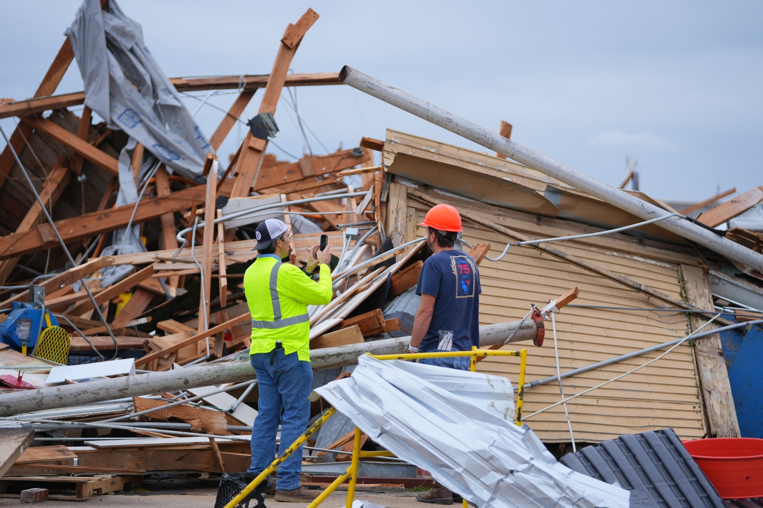 A person takes a photo of a destroyed structure following a storm in Mineral Wells, Texas, April 29, 2026.